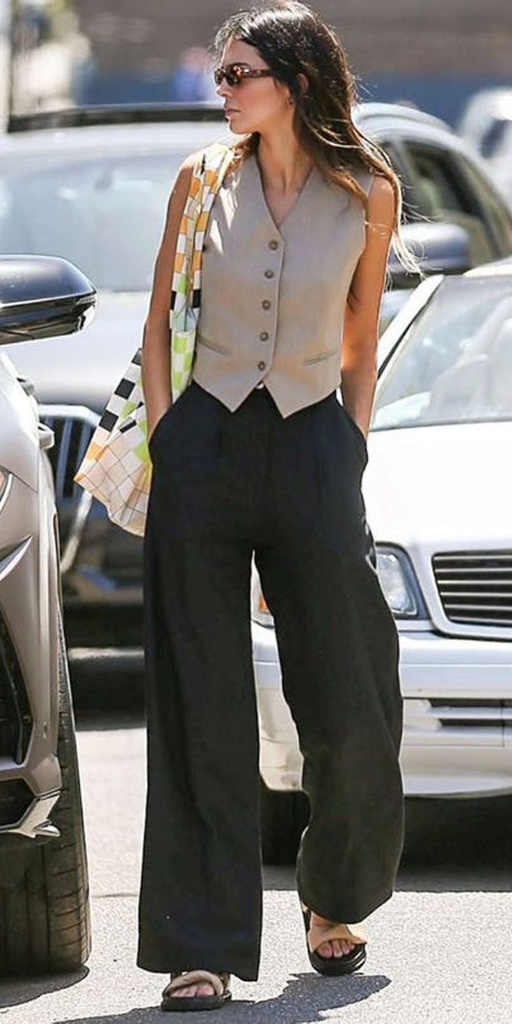 A sophisticated sleeveless beige vest with button details and tailored fit, complemented by relaxed black wide-leg pants. Effortless office-to-evening style with modern tailoring.